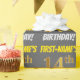 This wrapping paper design features a message like "FIRST-NAME’S 14th BIRTHDAY!", with the "14th" having a faux/imitation gold-like colour appearance, and with the name and "BIRTHDAY" in a fun, bold font. The name can be customised, and the background is coloured grey (grey). Wrapping paper like this could perhaps be used when wrapping birthday gifts being given to somebody in celebration of their fourteenth birthday. [~Z0000211]