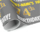 This wrapping paper design features a message like "FIRST-NAME’S 74th BIRTHDAY!", with the "74th" having a faux/imitation gold-like colour appearance, and with the name and "BIRTHDAY" in a fun, bold font. The name can be customised, and the background is coloured grey (grey). Wrapping paper like this could perhaps be used when wrapping birthday gifts being given to somebody in celebration of their seventy fourth birthday. [~Z0000211]