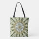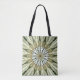 A kaleidoscopic fractal creates a circle of grey feathers, giving this tote bag the feeling of Native American art.