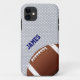 Custom American football fan iPhone 5 case, with graphics of a grey jersey look background. Graphics of a football decorates the bottom right corner of the case and custom blue coloured text, on the left side, is ready to personalise. Great phone case for the sports fan or football player.
