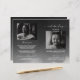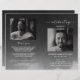 Funeral memorial program featuring on the front a photo of the deceased, thier name, dates, the memorial venue, date of the event, and elegant frame. On the inside is an obituary, and order of service; and on the back another photo, a thank you note and the second venue for after the funeral.