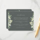 A dark grey green flat wedding reception enclosure card featuring an edging of hand painted snowberries and eucalyptus on the front and a wreath on the back of the card. All text is fully editable and the scattered dots on the front and back can be deleted before ordering if you would prefer. This card is available with alternative botanical designs, in a portrait format, and in different colours. Please view the Collection in my store to see all options and coordinating items.