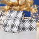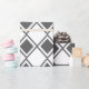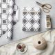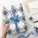 This wrapping paper has a mid-century modern design of solid grey diamonds inside grey diamond outlines on a field of white.