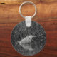 Keychain / keyring with black and white photo of a grey heron with snow falling in winter.