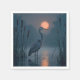 A grey heron stands gracefully in shallow water surrounded by tall reeds as the pink moon casts a warm glow across the scene