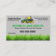 Lawn service business card. with a green and yellow zero turn lawnmower on it.
