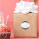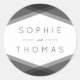 This modern wedding sticker features a grey layered geometric design featuring the names of the wedding couple.