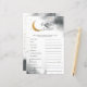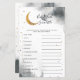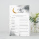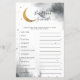 Cute over the moon theme baby shower baby word scramble card featuring watercolor splash in grey with faux gold moon and stars. The list of words on this card are all related to babies and they are scrambled. The guests are going to compete who can unscramble all of them first! ANSWER KEY: 1. car seat 2. milk 3. playpen 4. pacifier 5. diaper 6. rocking chair 7. nursery 8. baby monitor 9. swaddle 10. formula 11. rubber ducky 12. stroller.
