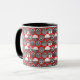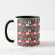 This mug has a geometric design of ovals with different patterns in grey in each half all on a field of red.