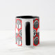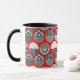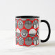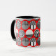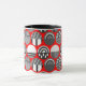 This mug has a geometric design of ovals with different patterns in grey in each half all on a field of red.