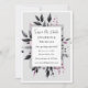 Wedding Save the Date with inspirational quote scripture depicts a modern floral botanical frame design with simple dark grey leaves and pink flowers. The back features Bible Verse Ephesians 5:31, "Two shall become One."