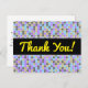 This postcard design features a grid-like abstract pattern of squares or tiles coloured shades of colours like grey, purple, beige and blue. It also features the message "Thank You!" on the front in yellow script-like text, along with a custom thank-you message on the back.