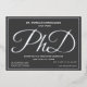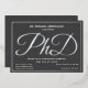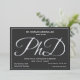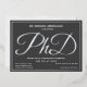 A PhD graduation party invitation with silver foil, white text, and a grey background. Simply add your information, add this invitation to your cart, and celebrate this major accomplishment.