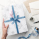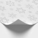 Christmas gift wrap with grey crystalline snowflakes against a snow white background.