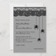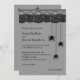 Dainty spiders hang from a photo illustrated lace border on this Halloween Wedding Invitation. The back is decorated with a black crystal chandelier and bats in flight. It is shown on the basic paper; however, i recommend the weight and texture of the linen paper.