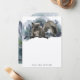 An elegant animal themed notecard featuring a watercolor painted baby grey squirrel with fixated eyes against a teal blue watercolor wash background. The back of the card features a large-sized image of the animal.