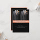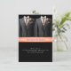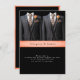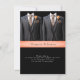 Formal, grey tuxedos with peach floral tie and pretty peach fuzz roses. Pretty peach fuzz, gradient ribbon for your text. Perfect gay wedding invitation for today's happy, modern couple.