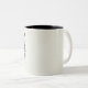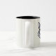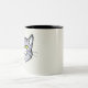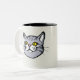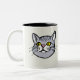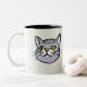 Simple two-tone mug with drawing of a grey tabby cat’s head with whiskers, gray grey silver striped striped hair fur, pink nose, white inside the ears, and golden yellow amber eyes.