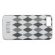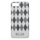 An iPhone 7/8 case designed with an argyle pattern in grey tones. Customise the iPhone case with your name or text among other options.