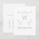 Modern and simple Whimsical Flourish Monogram Save the Date Postcard featuring an elegant swirl motif in grey. Easy to customise, simply add your initial and wedding details in the text fields provided. Click "Customise It" to find more personalisation options.