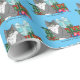 A grey and white long haired kitten sitting amongst Christmas presents and a few broken Christmas ornaments.
