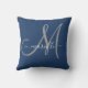 Personalised grey and white monogrammed pillow with a script font on a navy blue background. Simple elegance.
