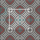 Modern fabric design featuring a seamless pattern made of geometric shapes in red and white on a grey background.