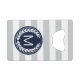 Modern grey and white wide striped pattern with custom laurel wreath logo monogram in navy blue to add your own initial, name or text - personalised credit card bottle openers.