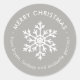 Affordable custom printed Merry Christmas round gift tag stickers personalised with your text. This simple modern holiday design features a white snowflake on a light grey background. Use the design tools to choose any background colour, edit text fonts and colours or upload your own photos to design your own unique holiday gift labels, envelope seals or stickers.