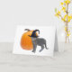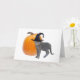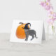 A grey cat wearing a black witch hat stands in front of an orange pumpkin. Add your own words to customise this spooky Halloween card.