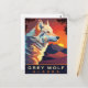 Grey wolf postcard. Mountains and a sunset behind. Travel postcard in vibrant colours.