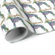 A colourful brindle greyhound with text "Greyhound" below, repeated on wrapping paper.