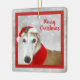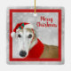 Greyhound Christmas -A red fawn and white greyhound dressed up in a red Santa hat and red collar set on a silver grey bokeh snow background. Framed with a red square frame. Merry Christmas in red script font can be personalised with your message.