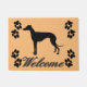 Greyhound silhouette with paw prints and "Welcome" text in black.