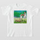 100% cotton so perfect for summer, It is a nicely designed t-shirt, the fabric is soft and the seams finished well, the body of the t shirt has no side seams. I bought a medium size for my two grandsons, aged 9 and 8 it will be slightly big on them but I would rather that than too small