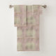 The original pattern by HomeWare on this Bath Towel Set is exactly what it’s called, a grid pattern made from an original photograph of the back of a chair. Dark grey and brown square dots in rows form the grid. The rows curve slightly as the chair does. Up close, the little square dots are holes with rounded corners and a shadow dimension around the upper and right hand edges. The colours of the body of the chair are muted, neutral tones, pale sage green blending into pale mauve, then soft, sandy brown, looking as if they have been painted on. This abstract design, with its sophisticated colour scheme, has a very modern look.