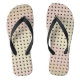 The original pattern by HomeWare on these wide strap Flip Flops is exactly what it's called, a grid pattern made from an original photograph of the back of a chair. Dark grey and brown square dots in rows form the grid. The rows curve slightly as the chair does. Up close, the little square dots are holes with rounded corners and a shadow dimension around the upper and right hand edges. The colours of the body of the chair are muted tones from nature, pale sage green blending into pale mauve, then soft, sandy brown, looking as if they'd been painted on. This abstract design, with its sophisticated colour scheme, has a very modern look.