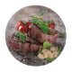 Grilled bbq steaks with fresh herbs and tomatoes cutting board