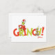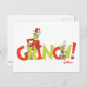 This vibrant and bold graphic is the perfect logo for the holiday mischief-maker! The word "GRINCH!" is displayed in large, stylised letters, primarily in festive red and lime green. The Grinch himself (in his Santa suit) stands right over the letters with his hands on his hips, looking mischievously proud. Beside him, his loyal partner, Max the Dog (complete with reindeer antlers), sits patiently. This fun graphic is a great way to celebrate the iconic characters and their story!