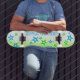 Get ready to hit the streets in style with this one-of-a-kind skateboard featuring a vibrant neon green and light blue spray paint design. Decked out with stars and the bold statement "Grind Time," this skateboard is a must-have for any skater looking to make a statement. Whether you're cruising the streets or hitting the skate park, this skateboard is sure to turn heads & showcase your unique style. Don't miss out on your chance to grab this eye-catching board & show off your skills in style!