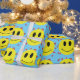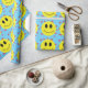 Classic grinning faces with red hearts on blue highlight this fun gift wrap.