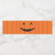 A Halloween water bottle label with the face of a grinning jack-o-lantern pumpkin. It has an orange and black colour scheme.