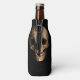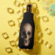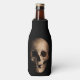 Grinning, creepy skull on bottle cooler. Zipper splits the skulls head right open! Black background.