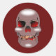 The design shows the digital painting of a grinning skull with a few teeth left in its mouth and red flowing holes for eyes and nose. The design is placed on a dark red background. You can easily change the colour of the background and / or add your own words by clicking on the "customise" button.