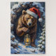 This dramatic oil painting captures a massive grizzly Bear, slightly groggy from hibernation, wearing a tattered Santa hat and carefully holding a glowing Christmas lantern. A powerful and rustic holiday design.