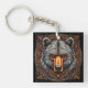 Highly stylised illustration of a bear's head, depicted with intricate details and vibrant colours. The bear's fur is primarily grey with hints of orange around its snout, giving it a striking appearance. Its eyes are intense and captivating, contributing to the powerful expression of the animal. The bear is encircled by an ornate decorative border, which adds an artistic flair and richness to the composition. The background is black, which enhances the overall drama and depth of the piece, making the bear stand out prominently. The combination of colours and intricate designs creates a visually compelling artwork that conveys strength and majesty.