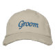 Custom Embroidered District Threads Distressed Chino Twill Baseball Cap Hat in Stone Colour with Groom in Royal Blue text typography lettering and digital graphic design by TheFabricSeal print on demand shop at Zazzle.com #ZazzleMade https://www.zazzle.com/store/thefabricseal TheFabricSeal©️Original.