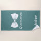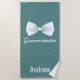 Groomsmen beach towel personalised. Dusty green and white groomsman design features scripted lettering, a bow tie illustration and easy to personalise name template.