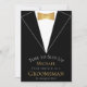 Its upper part suggests a black elegant suit with white shirt and gold bowtie from faux gold foil. In the lower part, the message "Time to suit up" is arched above the message "your service as a Groomsman is requested", with the word Groomsman in bigger caps. The name and the word Groomsman are golden, the rest of the text is white. the background is black.