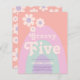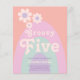 Groovy five, celebrate her 5th birthday with this cool retro 1970s vintage pastel colours lavender purple, pink, mint green and orange rainbow arch fifth birthday party invitation. With simple daisy design and easy to use templates this custom invite sets the seen for a cool groovy hippie girls party. Original artwork by artist Catherine Sweetman